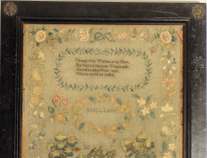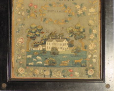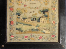 from Eliza's sampler. Caroline's sampler shows a country scene with two houses and a charming clock tower in the distance as well as a stream running under a wonderful stone